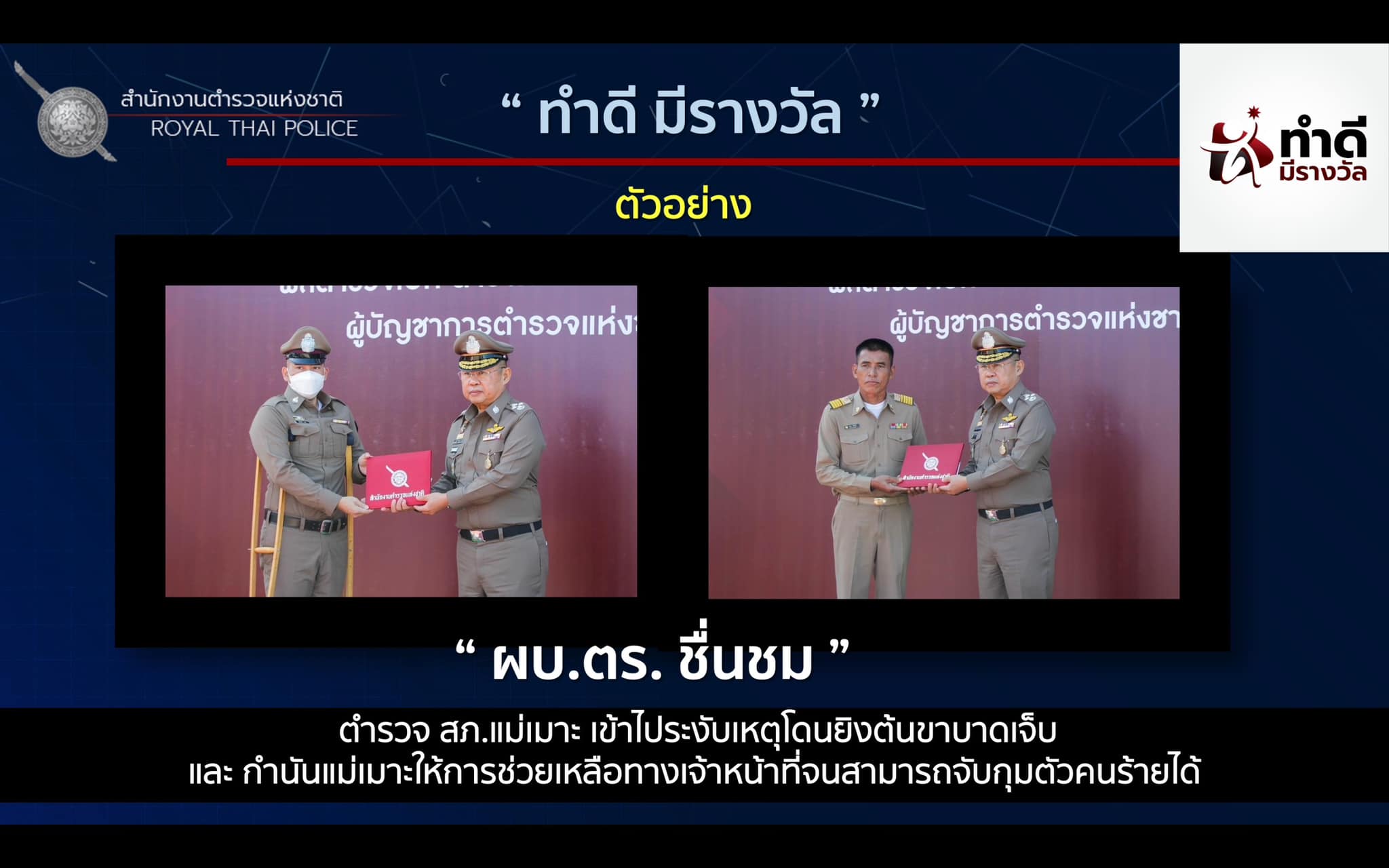 พล.ต.อ.ดำรงศักดิ์ฯ ผบ.ตร. ได้มอบเกียรติบัตรตามโครงการ “ทำดี มีรางวัล” สำนักงานตำรวจแห่งชาติ จำนวน 8 เรื่อง โดยเป็นข้าราชการตำรวจ จำนวน 12 นาย และประชาชน 3 นาย เช่น การช่วยเหลือ ประชาชน นำส่งเด็กผลัดหลง การปฐมพยาบาล(ปั้มหัวใจ) ช่วยเหลือรถจักรยานยนต์ตกคลอง การจับกุมคนร้ายใช้อาวุธปืน ช่วยเหลือเด็กหญิง เจรจาคนพยามยามจะกระโดดสะพาน ใช้ไหวพริบในการจับกุมยาเสพติดกว่า 5 ล้านเม็ด อีกทั้ง ยังมีผู้ได้รับเกียรติบัตรตามโครงการนี้ ที่เสนอขึ้นมาจากหน่วยงานต้นสังกัด(37หน่วย) โดยเดือน ต.ค. 65 มี 46 ราย (ตำรวจ 37 ราย กับพลเมืองดี 9 ราย) และเดือน พ.ย. 65 มี 43 ราย (ตำรวจ 37 ราย กับพลเมืองดี 6 ราย) รวมจำนวน 89 ราย