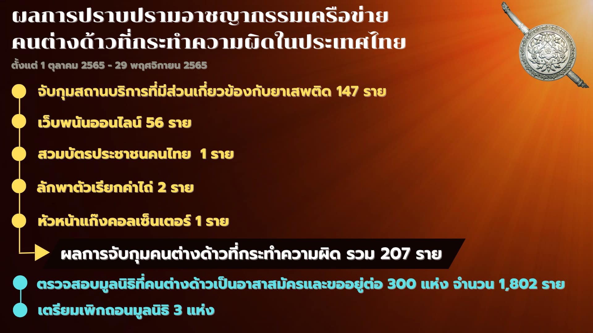 4.2 ขยายจับกุมเครือข่ายนายทุนจีนผิดกฎหมาย จากกรณี ร้านผับจินหลิง คดีที่เมื่อวันที่ 26 ต.ค.65 เข้าตรวจค้น พบผู้ใช้ยาเสพติดกว่า 104 ราย และพบยาเสพติดจำนวนมาก พร้อมตรวจยึดรถยนต์หรู จำนวน 35 คัน จากการขยายผลพบเพิ่มอีก 4 กรณี ได้แก่
