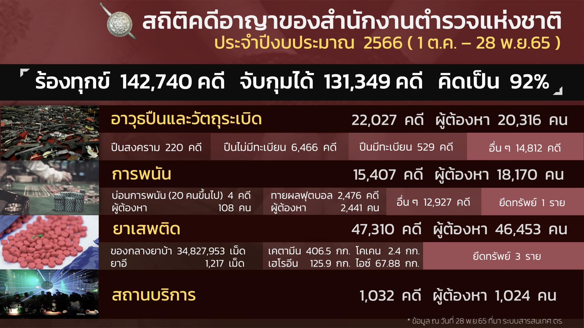 1. สถิติอาชญากรรม สำนักงานตำรวจแห่งชาติ (1 ต.ค.- 28 พ.ย.65) รับคำร้องทุกข์ 142,740 คดี จับกุมได้ 131,349 คดี คิดเป็น ร้อยละ 92