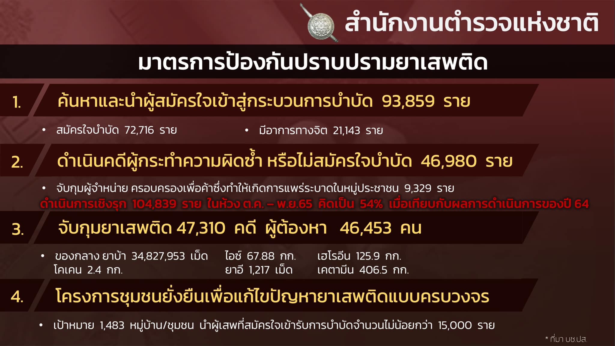2.3 จับกุมยาเสพติด 47,310 คดี ผู้ต้องหา 46,453 คน ปริมาณของกลางยาบ้า 34,827,953 เม็ด ไอซ์ 67.88 กิโลกรัม เฮโรอีน 125.9 กิโลกรัม เคตามีน 406.5 กิโลกรัม โคเคน 2.4 กิโลกรัม และ ยาอี 1,217 เม็ด,ดำเนินการตามยึดทรัพย์ ตามมาตรการฟอกเงิน 3 ราย