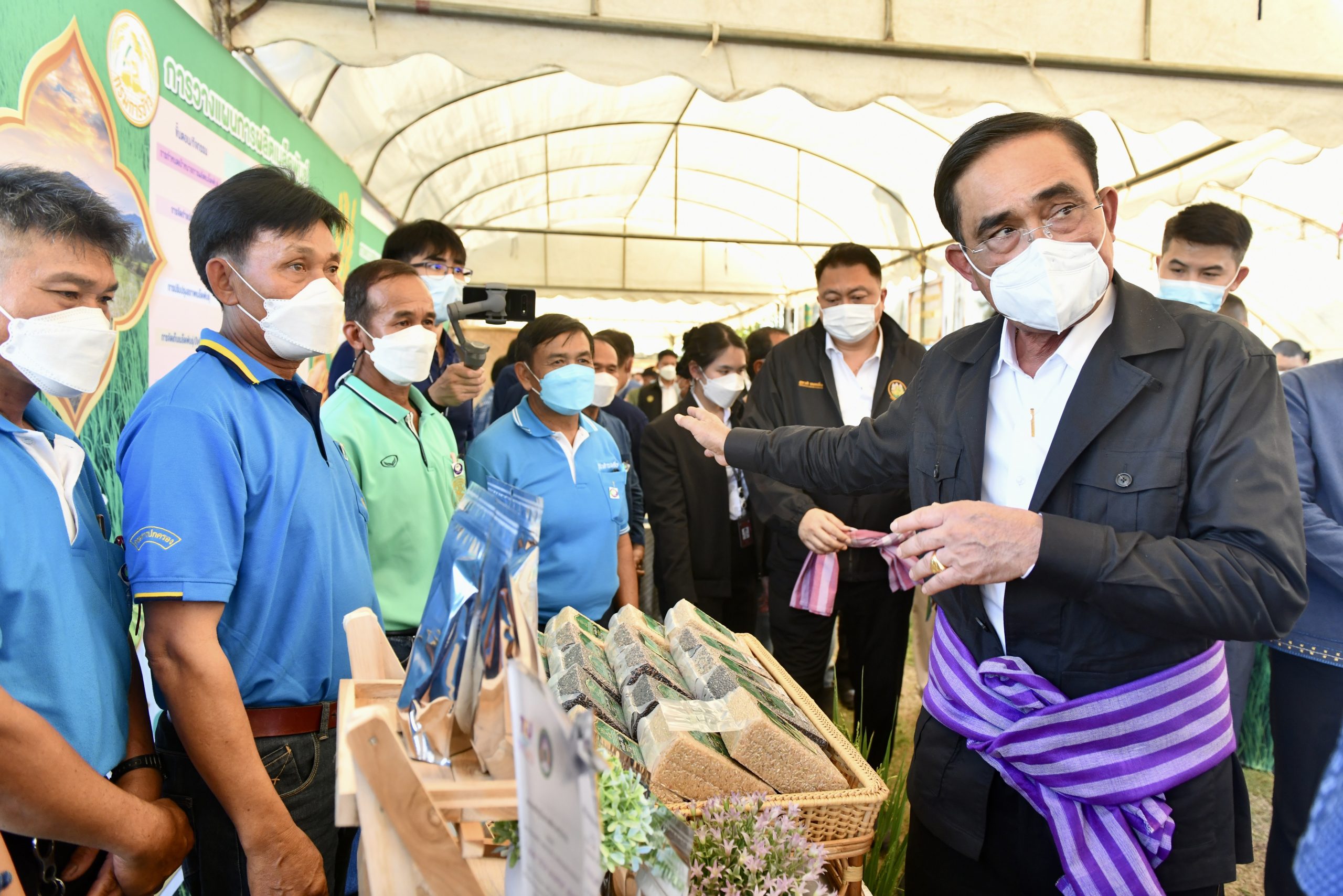 ในตอนท้าย นายกรัฐมนตรีพบปะเกษตรกร และเยี่ยมชมนิทรรศการ ได้แก่ กระบวนการผลิตข้าวและการทำนารูปแบบ BCG การวางแผน การตรวจสอบ และประโยชน์ การสาธิตเทคโนโลยีทางการเกษตร เช่น โดรน เครื่องสีข้าว เครื่องคัดแยกเมล็ดพันธุ์ ชมผลิตภัณฑ์ชุมชน ได้แก่ ผ้าทอมือ งานจักสาน ผลิตภัณฑ์ชุมชน และสมุนไพรต่าง ๆ เป็นต้น ก่อนออกเดินทางไปตรวจเยี่ยมการดำเนินงานของโรงพยาบาลวัดห้วยปลากั้งเพื่อสังคม ตำบลแม่ยาว อำเภอเมืองเชียงราย จังหวัดเชียงรายต่อไป