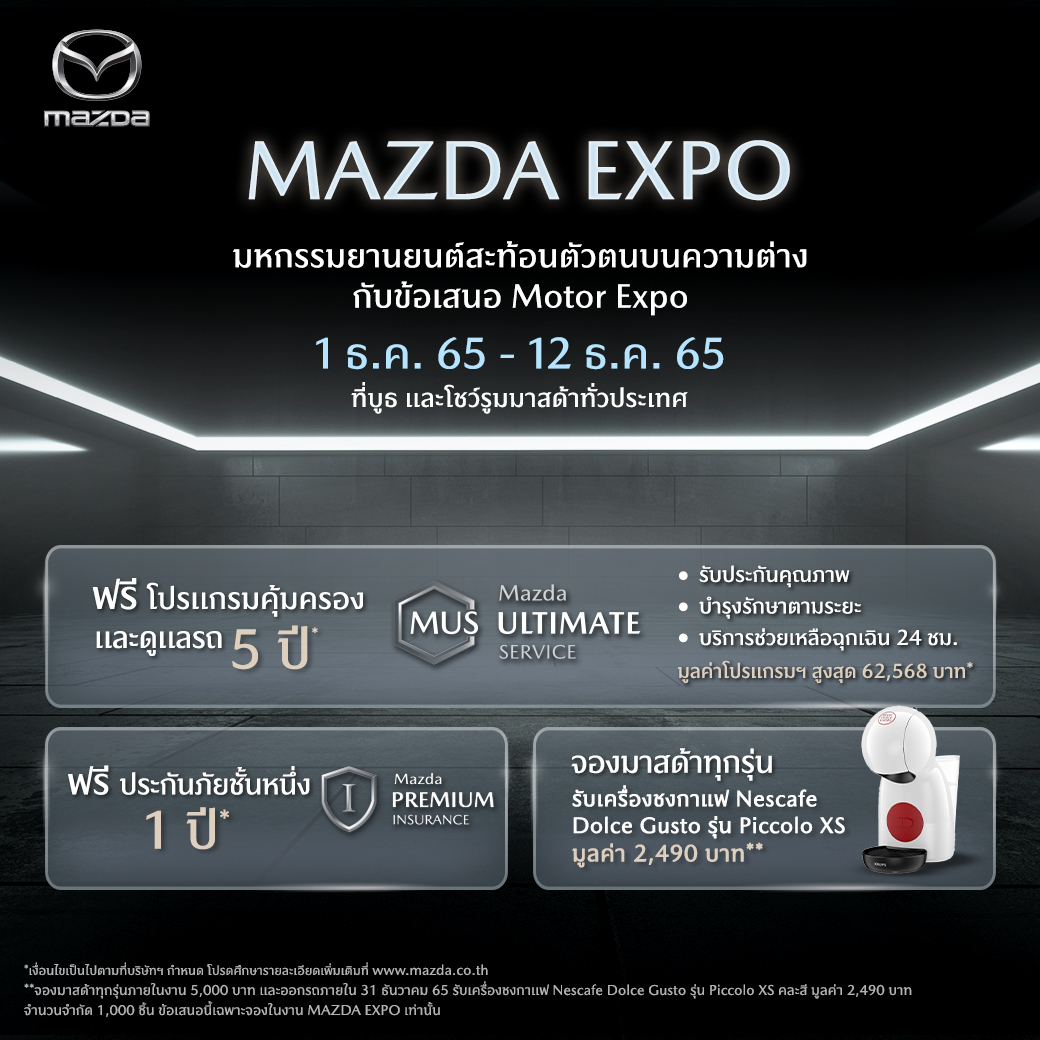 ไม่เพียงเท่านี้ มาสด้ายังได้เตรียมเครื่องชงกาแฟ Nescafe Dolce Gusto มูลค่า 2,490 บาท* เพื่อมอบให้กับลูกค้าที่จองซื้อรถมาสด้าทุกรุ่นภายในงานฯ อีกด้วย ลูกค้าที่สนใจสามารถพบกับข้อเสนอต่างๆ นี้ ได้ที่งาน มอเตอร์ เอ็กซ์โป 2022 หรือรับข้อเสนอเดียวกันนี้ได้ที่โชว์รูมมาสด้าใกล้บ้านทั่วประเทศ