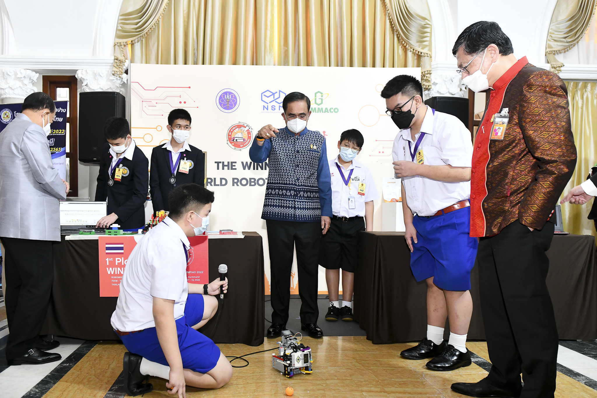 นายกรัฐมนตรีแสดงความยินดีกับความสำเร็จของตัวแทนเยาวชนทีม ThaiHerbGood จากโรงเรียนอัสสัมชัญลำปาง จังหวัดลำปาง ที่คว้ารางวัลชนะเลิศ และทีม PANYA ROBOT จากสถาบันปัญญาโรบอท กรุงเทพฯ ที่คว้ารางวัลรองชนะเลิศอันดับ 2 ในการแข่งขันโอลิมปิกหุ่นยนต์ระดับนานาชาติ ประจำปี 2565