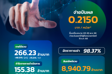ประชาสัมพันธ์November 14, 2025<November 14, 2025 PROSPECT REIT ทุบสถิติอัตราการเช่านิวไฮ ไตรมาส 3/68 พุ่งแตะ 98.37% ชี้ดีมานด์ต่างชาติเช่าโรงงานพื้นที่ Free Zone สุดแกร่ง เตรียมจ่ายปันผล 0.2150 บาทต่อหน่วย