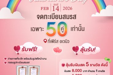 ประชาสัมพันธ์January 29, 2026<January 29, 2026 ซูเลียน ร่วมกับอำเภอบางบัวทอง เนรมิตวันวาเลนไทน์ ชวนคู่รักเริ่มต้นชีวิตคู่ จดทะเบียนสมรส ณ 1st Avenue